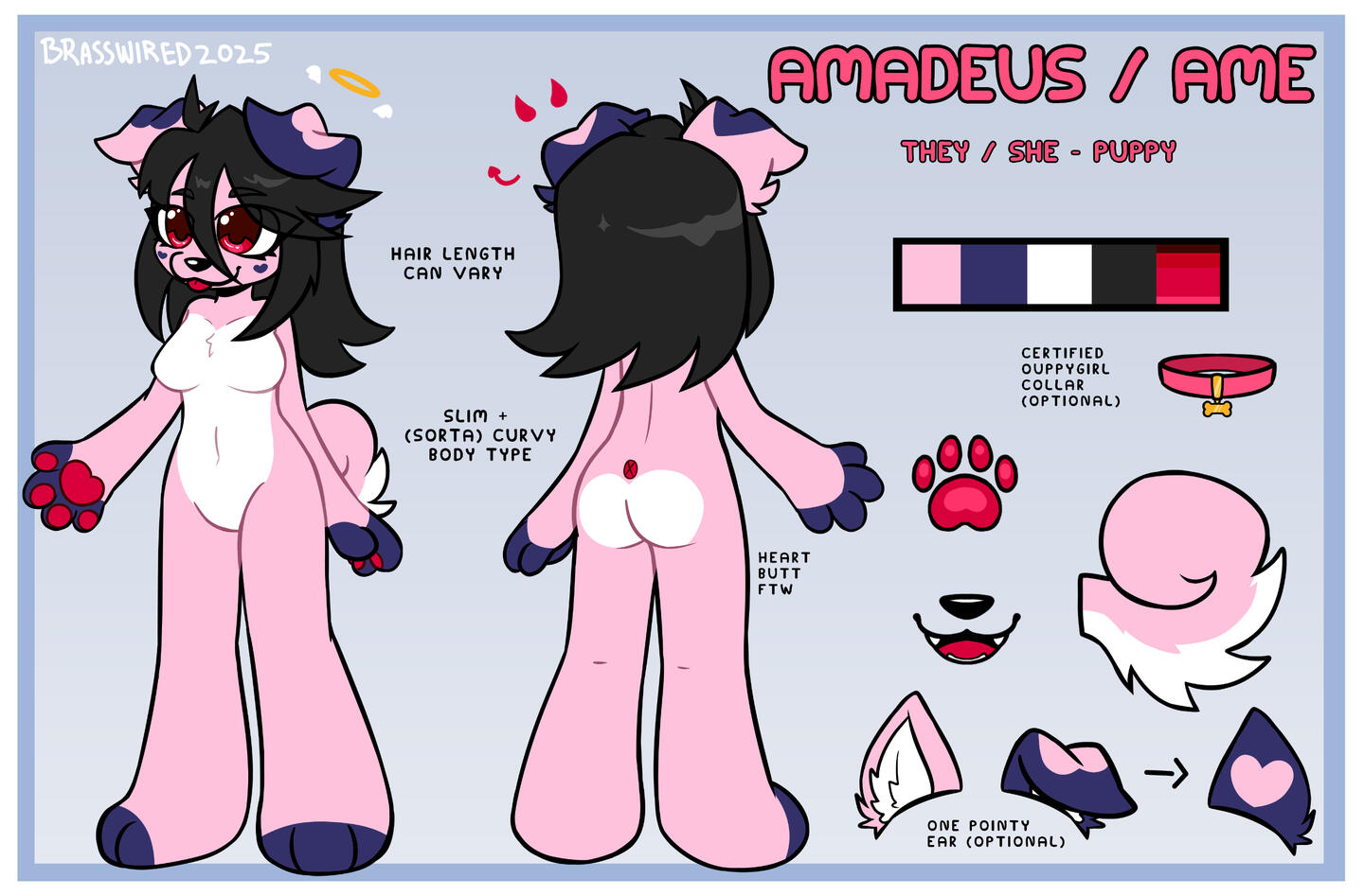 Ame is a 20-something genderfluid puppygirl with many mental issues and a strong love for the 2000s! She spends lots of her time at home claiming to be drawing, but she’s usually sleeping or watching TV and playing rhythm games.They have a masculine variant/design! (it’s just Ame with shorter hair and no eyelashes lol)